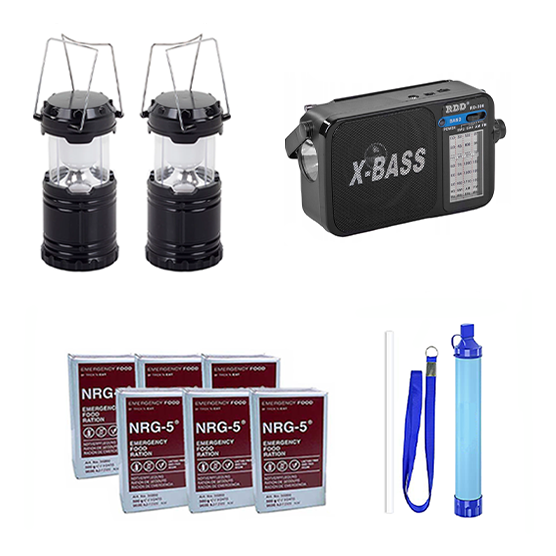 1 Noodradio, 2 noodlantaarns, 1 persoonlijke waterfilter en 6 pakken NRG5 noodrantsoen.