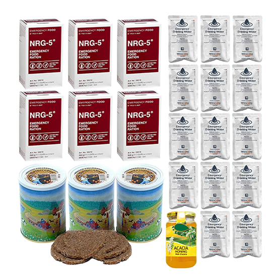 6 Pakken NRG5 noodrantsoen, 3 x zeer lang houdbare volkoren brood in blik, 1 x zeer lang houdbare honing en 14 x 0,5 liter lang houdbare drinkwater.